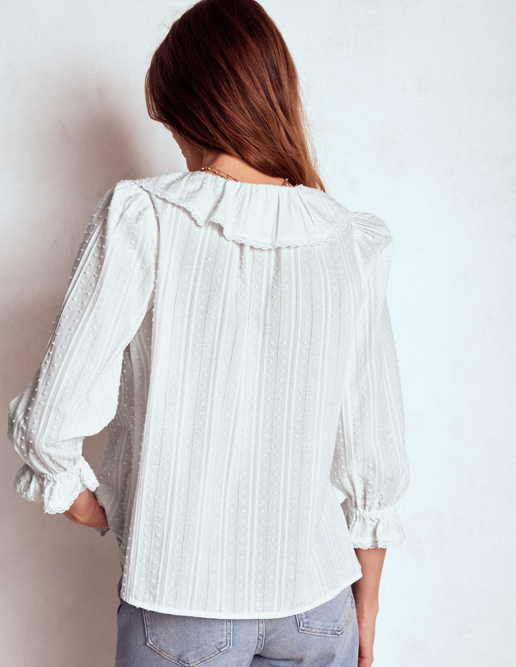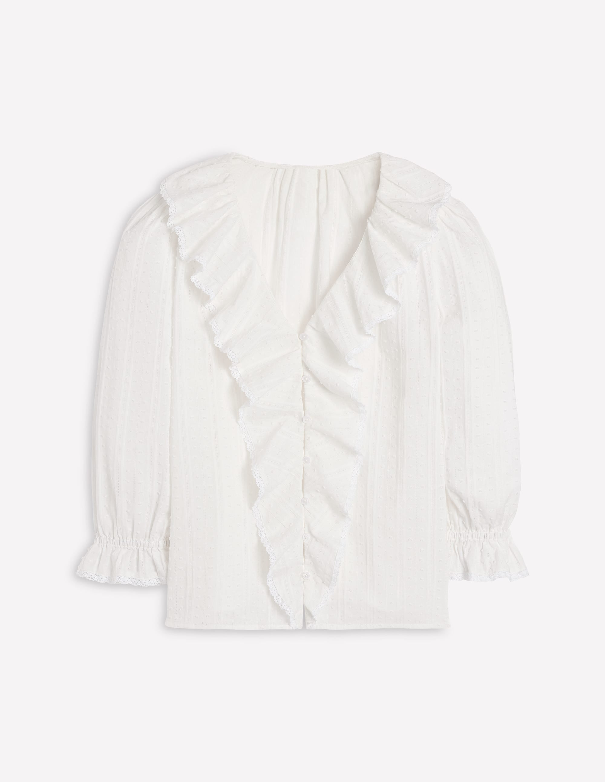 A romantic ruffle is the perfect seasonal update. Spun from pure cotton, this boho-inspired blouse is a joy to wear and we added some dotty texture too. Pair with high-waisted denim and you’re well on your way to an Almost Famous moment.