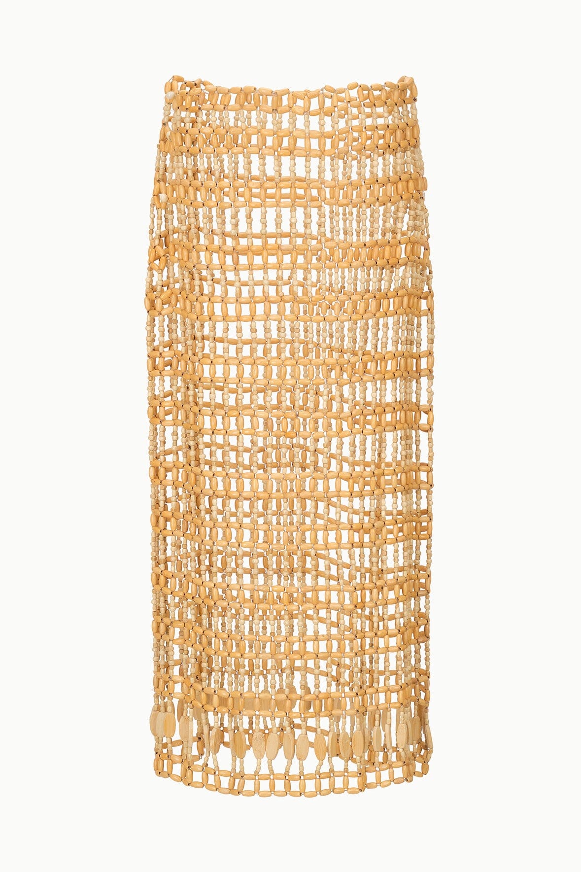 The Abaco is a midi length skirt handcrafted in wooden beads, it can be worn as a see-through skirt or as a swim cover up; it is a slip-on style with a button closure. This can be worn as a matching set with the Thatch Top.