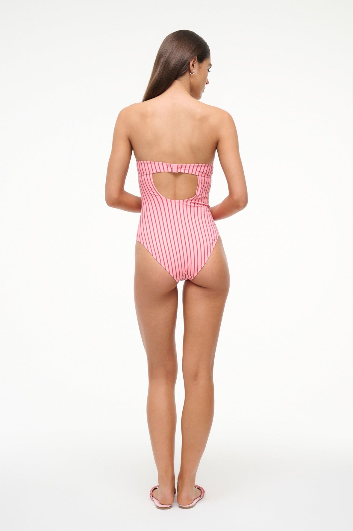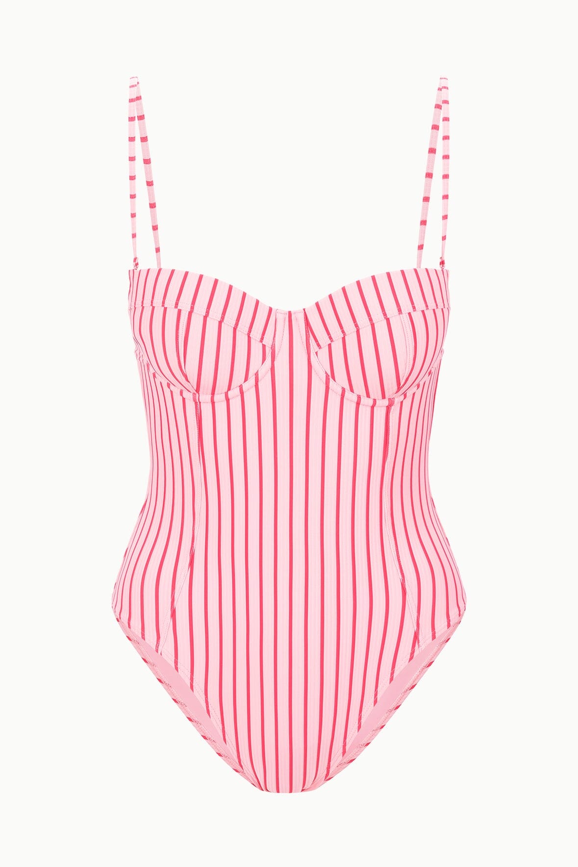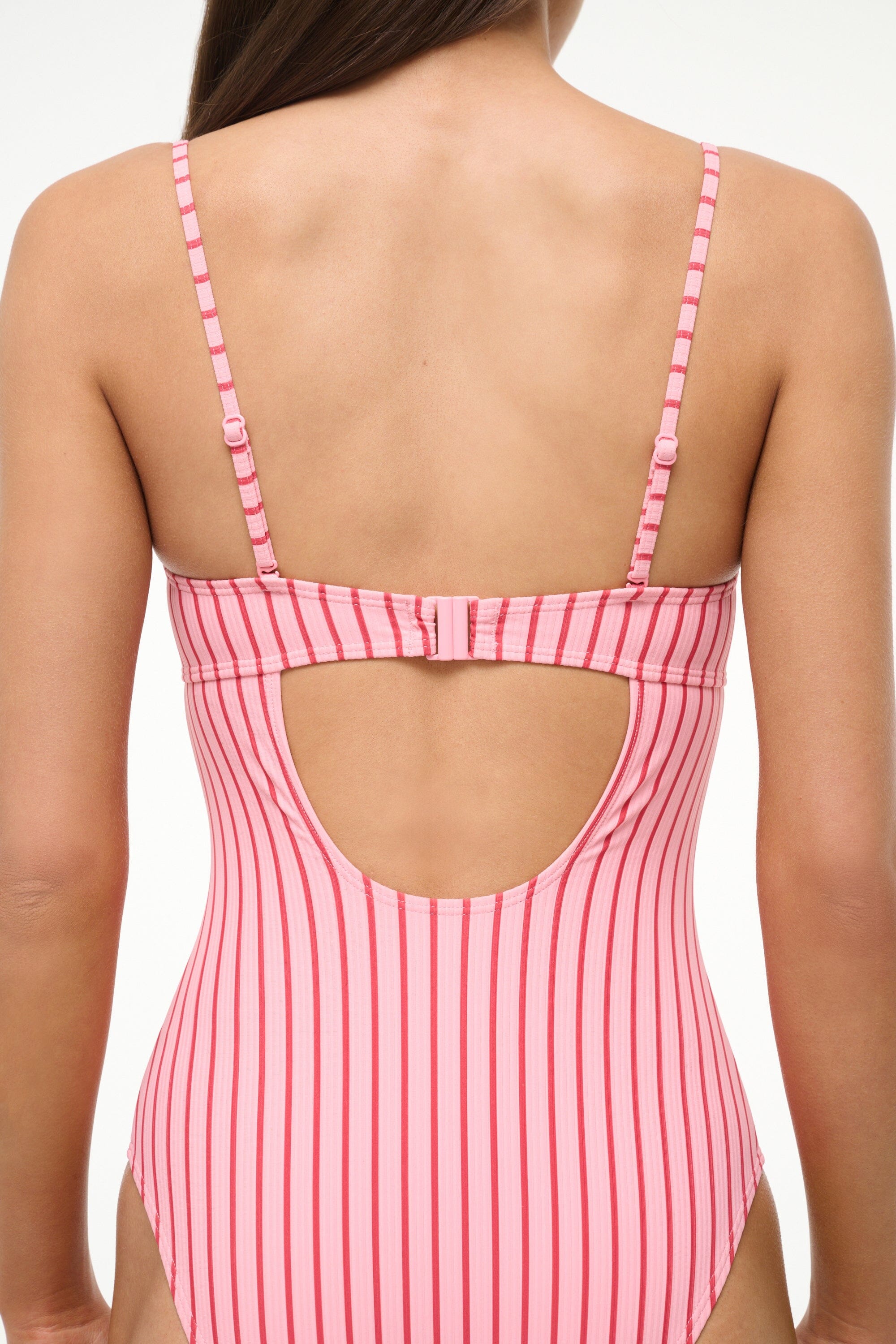 The Maeve One Piece features a bustier inspired bodice. This style has removable spaghetti straps and a low back.