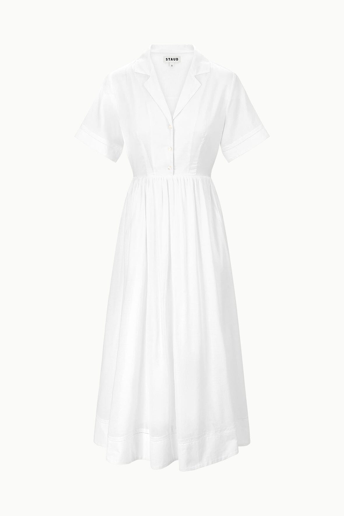 This is a midi length shirt dress with center front buttons and a camp collar. The Meryl has a full skirt and elastic at the waist for ease.