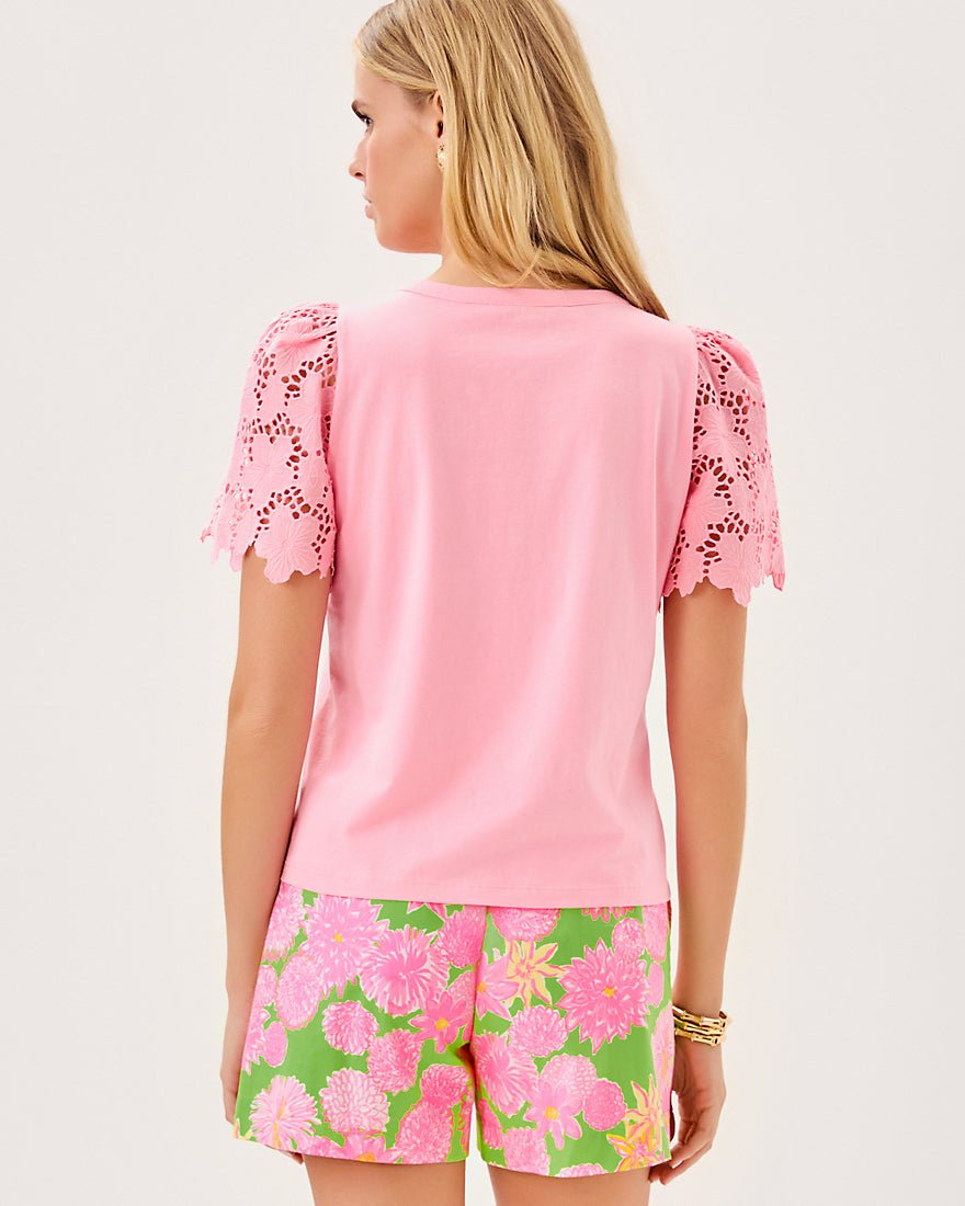 - Straight fit top with a banded crew neckline and unlined eyelet sleeves.